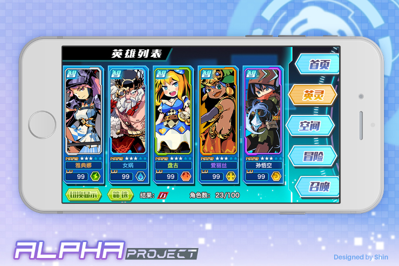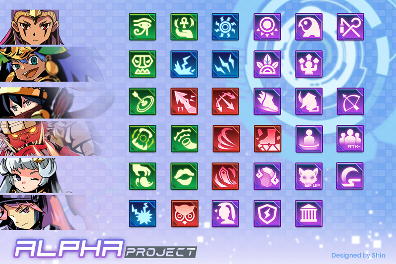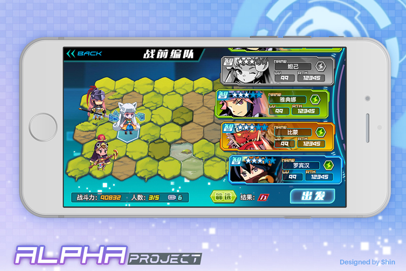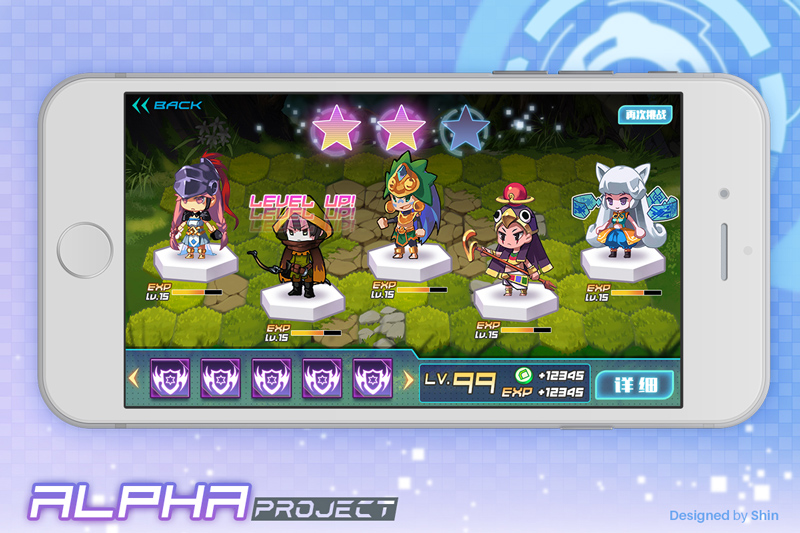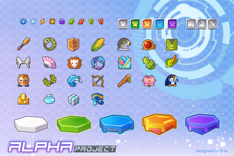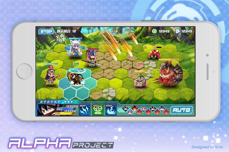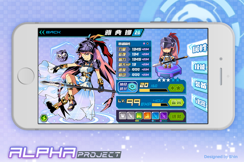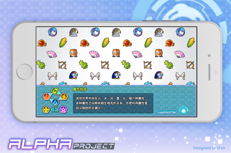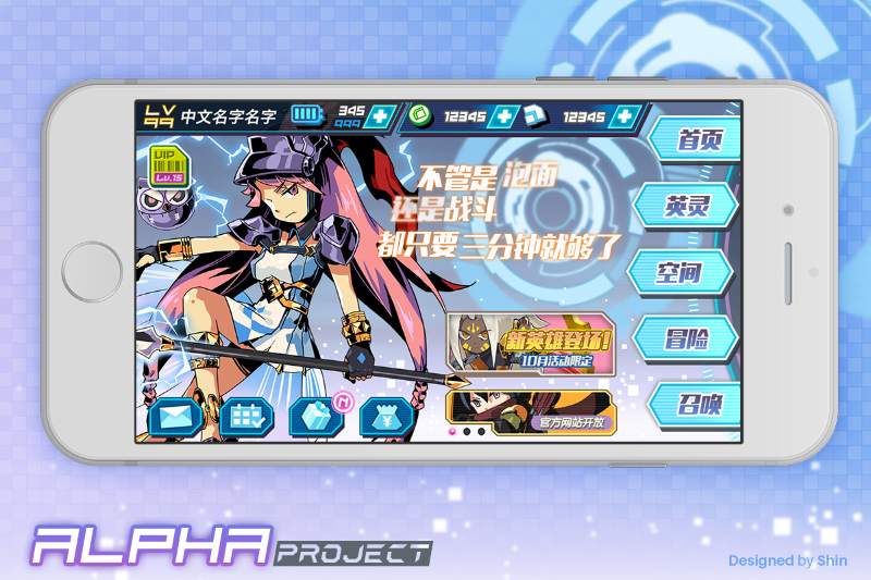 Content: Alpha为一个日系电子风格战旗类手游项目,主要为其设计整体UI界面、道具ICON、以及人物设定风格。